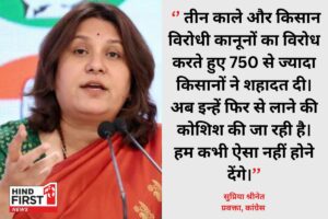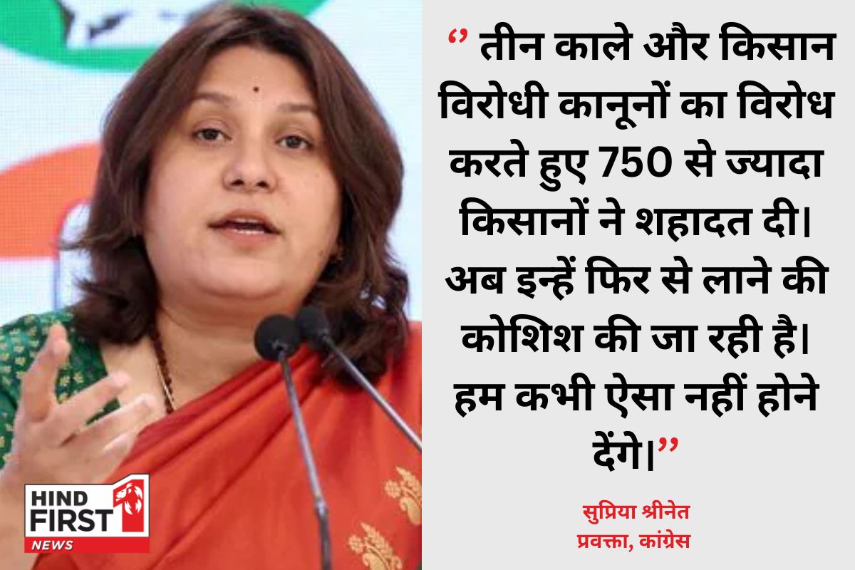 वहीं, कांग्रेस ने कंगना के इस बयान पर तीखी प्रतिक्रिया दी है। कांग्रेस ने कहा कि उनकी पार्टी कभी ऐसा होने नहीं देगी। कांग्रेस की प्रवक्ता सुप्रिया श्रीनेत ने कहा, ''तीन काले और किसान विरोधी कानूनों का विरोध करते हुए 750 से ज्यादा किसानों ने शहादत दी। अब इन्हें फिर से लाने की कोशिश की जा रही है। हम कभी ऐसा नहीं होने देंगे।'' उन्होंने हरियाणा विधानसभा चुनाव की ओर इशारा करते हुए कहा, "हरियाणा सबसे पहले इसका जवाब देगा।"