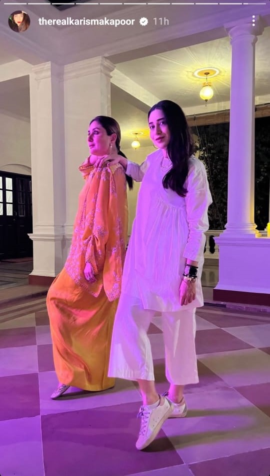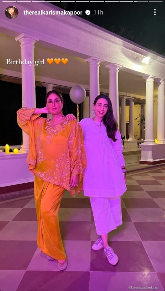 Kareena और करिश्मा एक साथ पोज देते हुए अगली फोटो में, करीना और करिश्मा ने बाहर पोज दिया और बैकग्राउंड में सजाया हुआ पटौदी पैलेस खड़ा था। उन्होंने लिखा, "Birthday girl 💛💛💛"