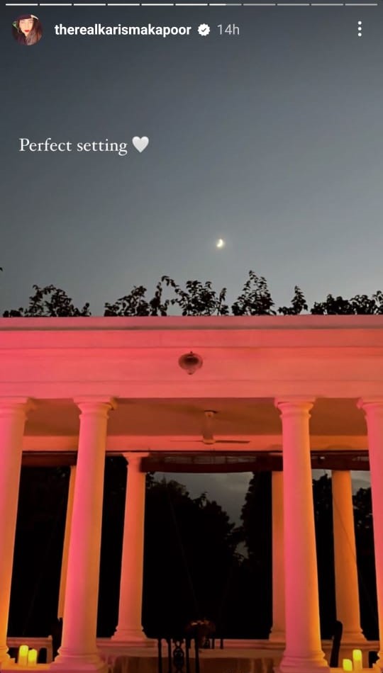 Kareena Kapoor गुरुवार को 43 साल की हो गईं और उनकी बहन करिश्मा कपूर ने पटौदी पैलेस में उनका जन्मदिन मनाते हुए कई तस्वीरें साझा कीं। करिश्मा कपूर ने बुधवार रात इंस्टाग्राम स्टोरीज पर पटौदी पैलेस और रात के आसमान की झलक दिखाते हुए एक तस्वीर पोस्ट की। उन्होंने लिखा, "Perfect setting (white heart emoji)."