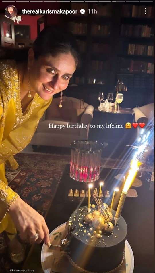 Kareena ने स्पेशल केक काटा अगली तस्वीर में करीना अपने जन्मदिन का केक काटती हुई नजर आ रही हैं। केक काटते समय वह मुस्कुराईं। फोटो में करीना yellow outfit पहने हुए एक मंद रोशनी वाले कमरे में खड़ी थीं। पास ही एक मेज पर कई पेय पदार्थ के गिलास दिखे। करिश्मा ने पोस्ट को कैप्शन दिया, "Happy birthday to my lifeline🤗❤️❤️"