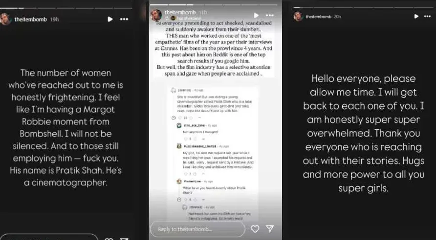 जो लोग नहीं जानते, उन्हें बता दें कि यह सब तब शुरू हुआ था, जब फिल्म निर्माता अभिनव सिंह ने अपने इंस्टाग्राम हैंडल पर प्रतीक का नाम लिए बिना एक स्टोरी साझा की थी। उन्होंने अपनी फीमेल फ्रेंड्स से 'खास सिनेमैटोग्राफर' से सावधान रहने को कहा था और उन्हें 'छेड़छाड़ करने वाला' और 'भावनात्मक रूप से अपमानजनक' कहा। अभिनव ने उन लोगों की भी आलोचना की जिन्होंने सिनेमैटोग्राफर को काम पर रखा।