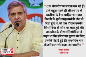 संदीप दीक्षित ने कहा कि जब दिल्ली के पूर्व उपमुख्यमंत्री जेल से रिहा हुए थ, तो उस दौरान उनकी सिसोदिया से फोन पर बात हुई थी। बातचीत के दौरान सिसोदिया ने कहा था कि हरियाणा चुनाव के लिए उनकी रिहाई हुई है। कुछ दिन बाद केजरीवाल भी बाहर आ जाएंगे। दीक्षित ने ये भी कहा कि जब झारखंड के सीएम हेमंत शोरेन जेल से बाहर आए थे, तो अदालत ने उन पर किसी भी तरह की रोक नहीं लगाई थी। लेकिन केजरीवाल पर सुप्रीम कोर्ट ने सरकारी फाइन साइन करने से रोक लगाई है। सुप्रीम कोर्ट ने केजरीवाल को मुख्यमंत्री कार्यालय जाने से भी मना किया है। कब हुई थी केजरीवाल की गिरफ्तारी