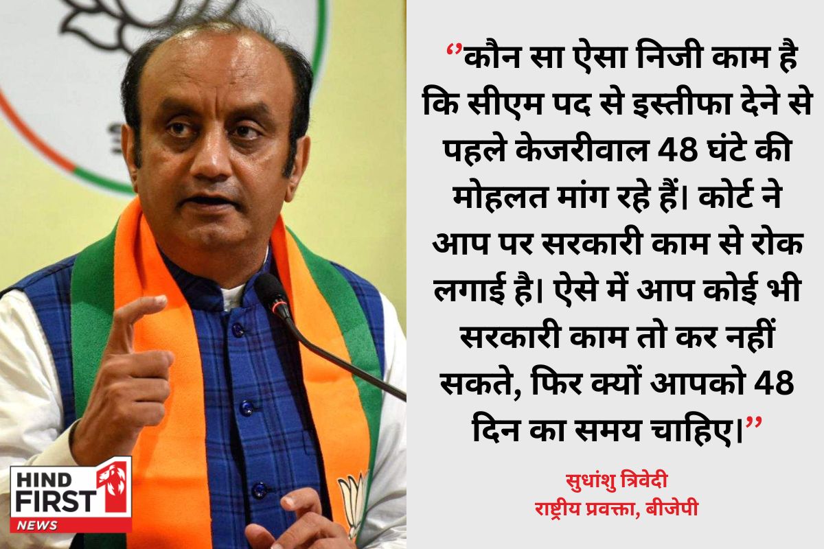 सुधांशु त्रिवेदी ने आगे कहा कि केजरीवाल के इस्तीफे के ऐलान के बाद अब ये साफ हो गया है कि उन्होंने जुर्म किया है। केजरीवाल ने मान लिया है कि उन पर जो आरोप लगे हैं वह सब सही है। इसलिए केजरीवाल सीएम पद छोड़ रहे हैं। अरविंद केजरीवाल के दिल्ली में नवंबर में विधानसभा चुनाव करने की मांग पर सवाल उठाते हुए बीजेपी नेता ने कहा कि यहां आपकी सरकार है। आप चाहें तो असेंबली भंग कर दें। आप पहले चुनाव करने की मांग क्यों कर रहे हैं। एक अन्य बीजेपी नेता ने केजरीवाल के इस्तीफे के ऐलान को पीआर स्टंट बताया है। उन्होंने कहा कि अब केजरीवाल को समझ में आ चुका है कि दिल्ली की जनता के सामने उनकी छवि कट्टर ईमानदार नहीं बल्कि कट्टर बेईमान की बन चुकी है। अरविंद केजरीवाल ने दिल्ली में अपनी खोई हुई छवि को वापस लाने के लिए इस्तीफे की घोषणा की है। उन्हे समझ में आ चुका है कि उनकी पार्टी चुनाव हार चुकी है। कांग्रेस ने क्या बोला कांग्रेस नेता संदीप दीक्षित ने कहा कि सीएम अरविंद केजरीवाल नाटक कर रहे हैं। केजरीवाल को बहुत पहले ही सीएम पद से इस्तीफा दे देना चाहिए था। उन्हें पहले ही पता था कि उनकी जमानत होने वाली है।
