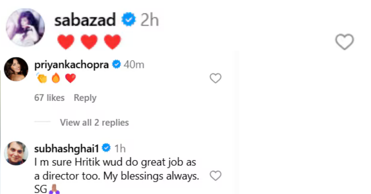 राकेश की पोस्ट पर कमेंट करते हुए प्रियंका चोपड़ा ने क्लैप, फायर और हार्ट की इमोजी पोस्ट की है। वहीं सुभाष घई ने लिखा है, “मुझे यकीन है कि ऋतिक एक निर्देशक के रूप में भी बेहतरीन काम करेंगे। मेरा आशीर्वाद हमेशा रहेगा।” इसके अलावा, ऋतिक की गर्लफ्रेंड सबा आजाद ने भी एक्टर पर प्यार बरसाते हुए कमेंट बॉक्स में रेड हार्ट इमोजी ड्रॉप किए। ये भी पढ़ें: