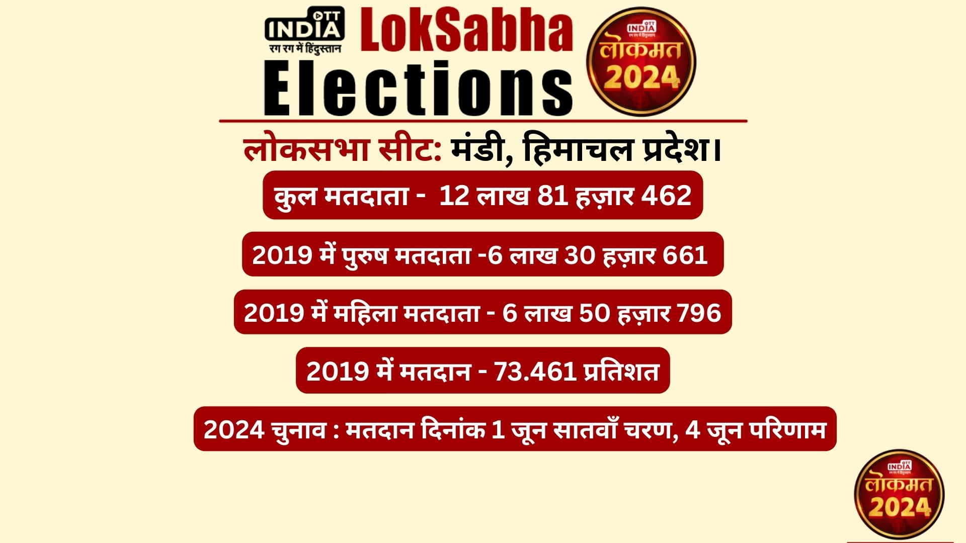 मंडी लोकसभा सीट क्षेत्र के अंतर्गत 17 विधानसभा सीटें आती हैं। इनमें से भाजपा के हिस्से में 12 सीटें हैं। विधानसभा सीटों में मंडी, नाचन, सुंदर नगर, सेराज, बल्ह, जोगिंदरनगर, कुल्लू, आनी, स्पीति, मनाली, बंजार, करसोग, रामपुर, किन्नौर, दरंग, भरमौर, लाहौल मंडी लोकसभा सीट के अंदर ही आती है। क्षेत्रफल के दृष्टिकोण से ये देश का दूसरा सबसे बड़ा लोकसभा क्षेत्र है। ऐसे में विधानसभा सीटों पर भाजपा भारी है।क्या कहते हैं 2019 के आंकड़े?