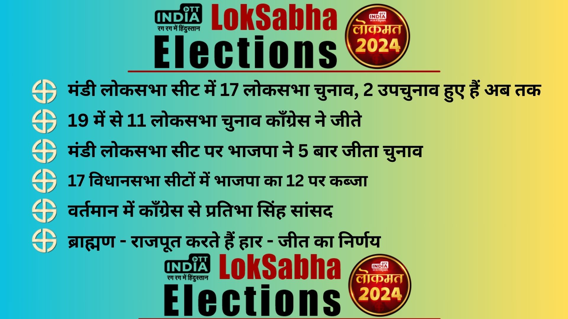 काँग्रेस के खाते में मंडी लगभग हर बार रही है। हालांकि भाजपा ने भी मंडी में 5 बार चुनाव जीता है। परंतु मंडी के लोकसभा चुनाव ज़्यादातर काँग्रेस के ही पक्ष में रहा है। अब तक काँग्रेस ने मंडी में कुल 13 बार जीत दर्ज की है। ऐसी स्थिति में नए खिलाड़ी यानि कंगना रनौत को मैदान में उतार कर बड़ा दाव खेला है। हिमाचल प्रदेश की मंडी लोकसभा सीट पर अब तक कुल 19 बार चुनाव हुआ है। इन चुनावों में काँग्रेस ने 13 बार जीत दर्ज की है।अब कौन है मैदान में?