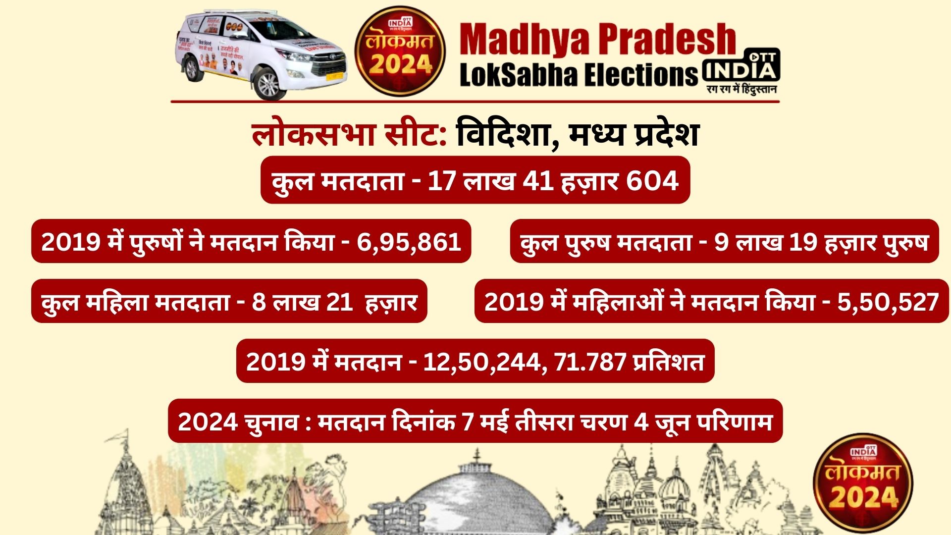 विदिशा सीट पर 2019 के चुनाव में कुल मतदाता 17 लाख 41 हज़ार 604 थे। चुनाव आयोग (LOKSABHA ELECTION2024 VIDISHA SEAT) के डाटा के अनुसार 17 लाख 41 हज़ार 604 में से 9 लाख 19 हज़ार पुरुष मतदाता थे, जबकि 8 लाख 21 हज़ार से अधिक महिला मतदाता थी। इस सीट से जातीय गणना देखें तो ये हिन्दू बाहुल्य इलाका है। यहाँ 88 प्रतिशत के लगभग हिंदुओं का मत चुनाव में हार जीत सुनिश्चित करता है। वहीं 10 फीसदी मुस्लिम आबादी भी इस सीट पर मतदान कर चुनाव का रुख पलट सकते हैं।लोकसभा चुनाव 2024