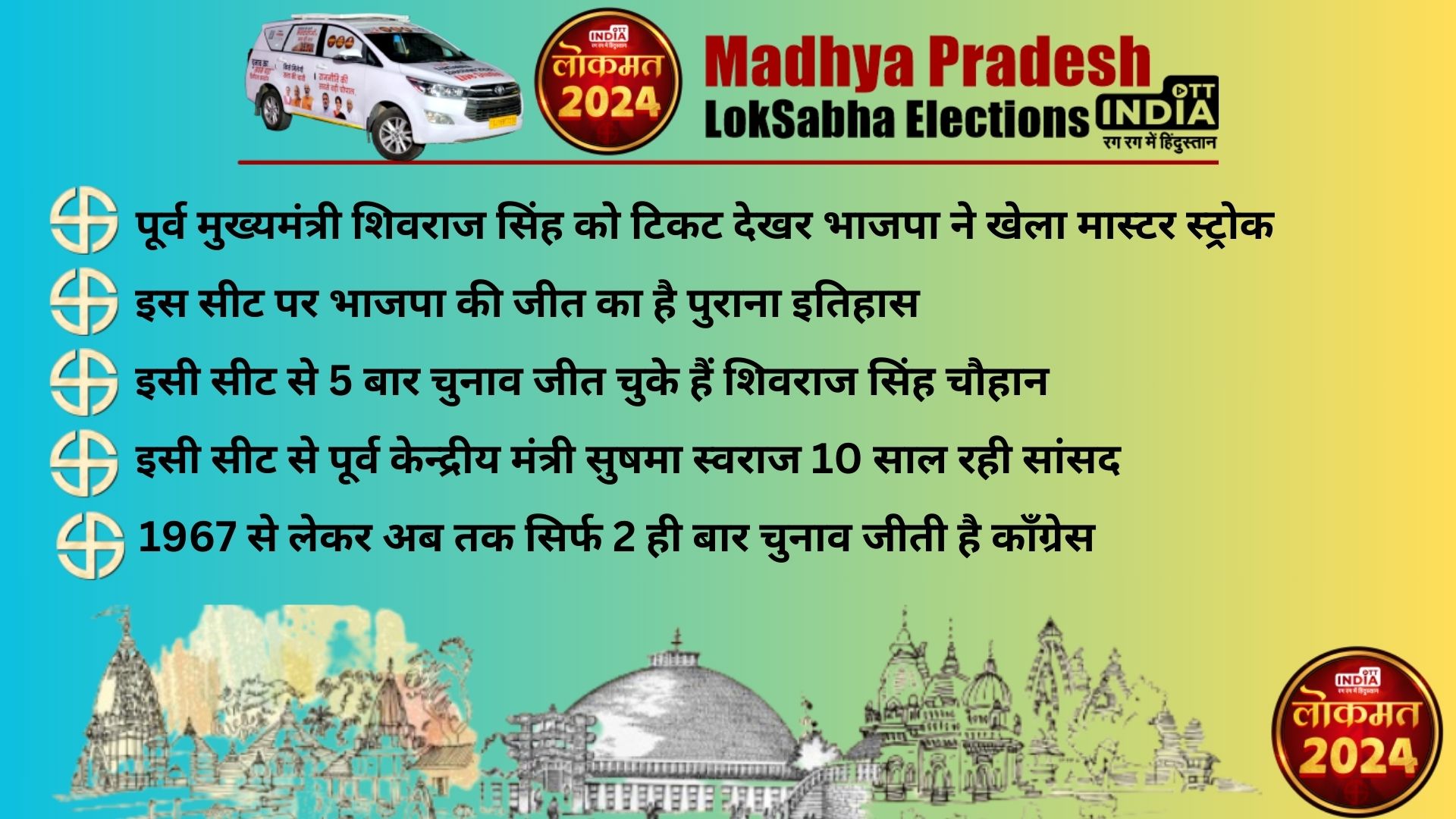मध्य प्रदेश की विदिशा सीट (LOKSABHA ELECTION2024 VIDISHA SEAT) फिर से चर्चा में इसलिए भी आई क्योंकि वहाँ से मध्यप्रदेश के पूर्व मुख्यमंत्री शिवराज सिंह चौहान को लोकसभा के लिए टिकट दी गयी। परंतु इससे पहले भी इस सीट का इतिहास बहुत दिलचस्प है। इसी सीट पर भाजपा के नेता और देश के पूर्व प्रधानमंत्री अटल बिहार वाजपेयी ने चुनाव जीता, इसी सीट से सुषमा स्वराज, जो भाजपा की प्रभावी नेत्री रहीं और साथ ही उनके हिस्से केन्द्रीय विदेश मंत्रालय भी आया। इसके अलावा भी एक और तथ्य है जो भाजपा के पक्ष का है, अभी तक इस सीट से भाजपा ने ही ज्यादा बार जीत हासिल की है। 2019 तक विदिशा में 16 बार लोकसभा चुनाव हुए और 16 में भी 11 बार भाजपा ने जीत दर्ज की। जबकि काँग्रेस अभी तक 2 ही बार यहाँ चुनाव जीत पाई।