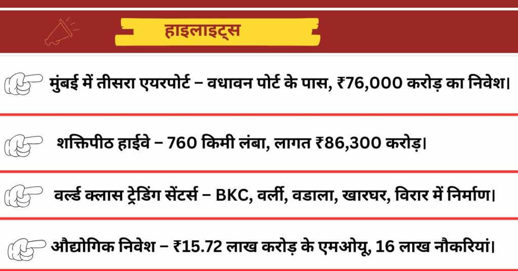 बजट में बुनियादी ढांचे के विकास पर विशेष ध्यान दिया गया है। मुंबई में वधावन पोर्ट के पास तीसरे एयरपोर्ट का प्रस्ताव रखा गया है। इसके लिए ₹76,000 करोड़ खर्च किए जाएंगे, जिसमें महाराष्ट्र की 26% हिस्सेदारी होगी। इसके अलावा, वर्धा जिले के पावना से सिंधुदुर्ग जिले की पात्रा देवी तक 760 किलोमीटर लंबा शक्तिपीठ हाईवे बनाया जाएगा। इस पर ₹86,300 करोड़ खर्च होंगे। खपोली-खंडाला लिंक रोड का काम अगस्त 2025 तक पूरा करने का लक्ष्य रखा गया है।