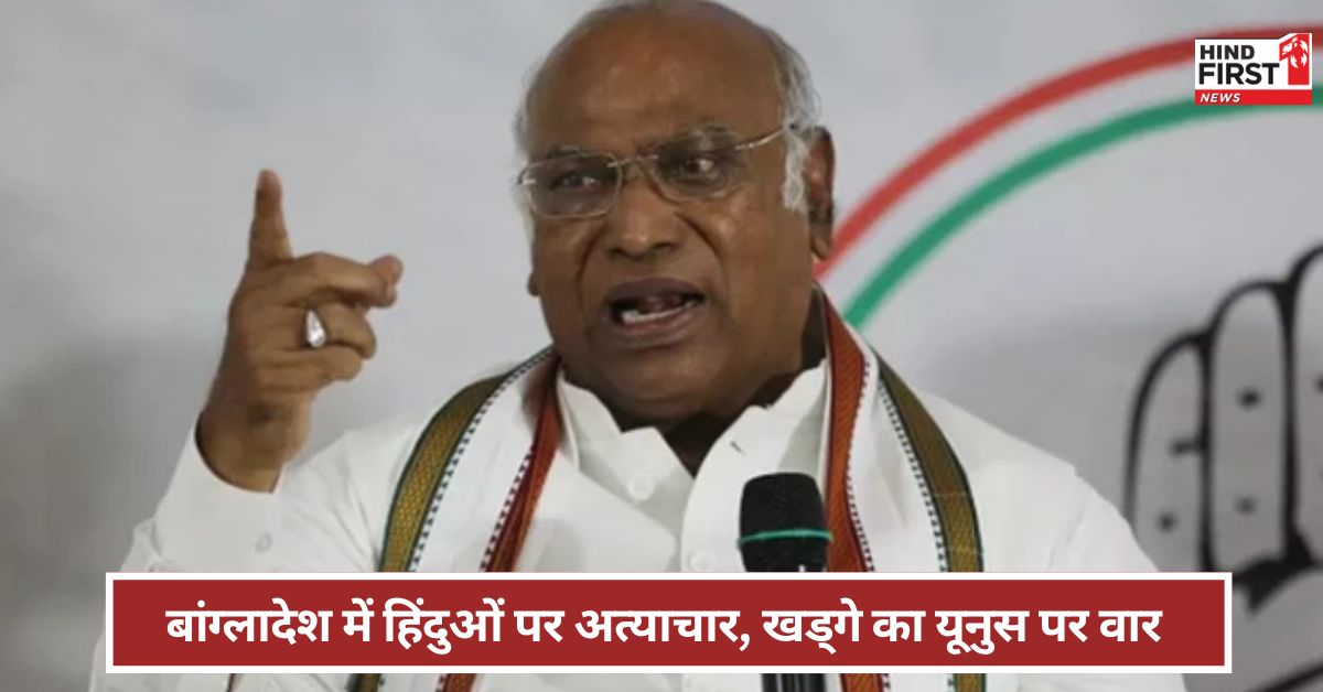 Mallikarjun Kharge on Bangladesh: बांग्लादेश में हिंदू नेता भावेश चंद्र की निर्मम हत्या कर दी गई। इस मामले में अब कांग्रेस के राष्ट्रीय अध्यक्ष मल्लिकार्जुन खड्गे ने बांग्लादेश की अंतरिम सरकार के मुख्य सलाहकार मोहम्मद यूनुस पर हमला बोला। (Mallikarjun Kharge on Bangladesh) खड्गे ने मोहम्मद यूनुस को मुक्ति संग्राम की याद भी दिलाई, तो वहीं खड्गे ने बांग्लादेश में हिंदुओं पर बढ़ते अत्याचार को लेकर PM मोदी को भी घेरने की कोशिश की।