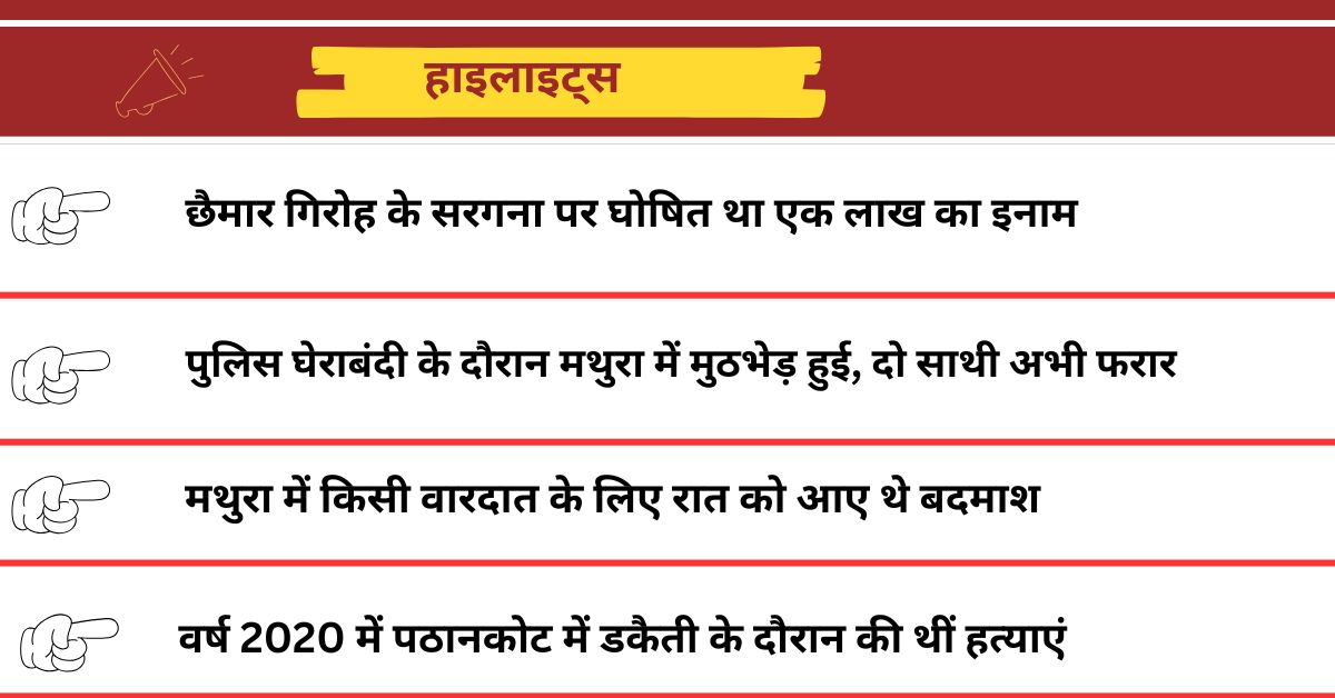मथुरा पुलिस ने एक बड़ी कामयाबी हासिल करते हुए छैमार गिरोह के सरगना असद उर्फ फाती को मुठभेड़ में ढेर कर दिया है। बता दें कि असद पर भारतीय क्रिकेटर सुरेश रैना के रिश्तेदारों की हत्या सहित कई गंभीर आरोप थे। हालांकि, उसके दो साथी फरार हो गए हैं, जिनकी तलाश में पुलिस जुटी हुई है। यह घटना मथुरा के कृष्ण कुंज कॉलोनी में रविवार तड़के हुई, जब पुलिस को मुखबिर से असद और उसके साथियों के बारे में जानकारी मिली।