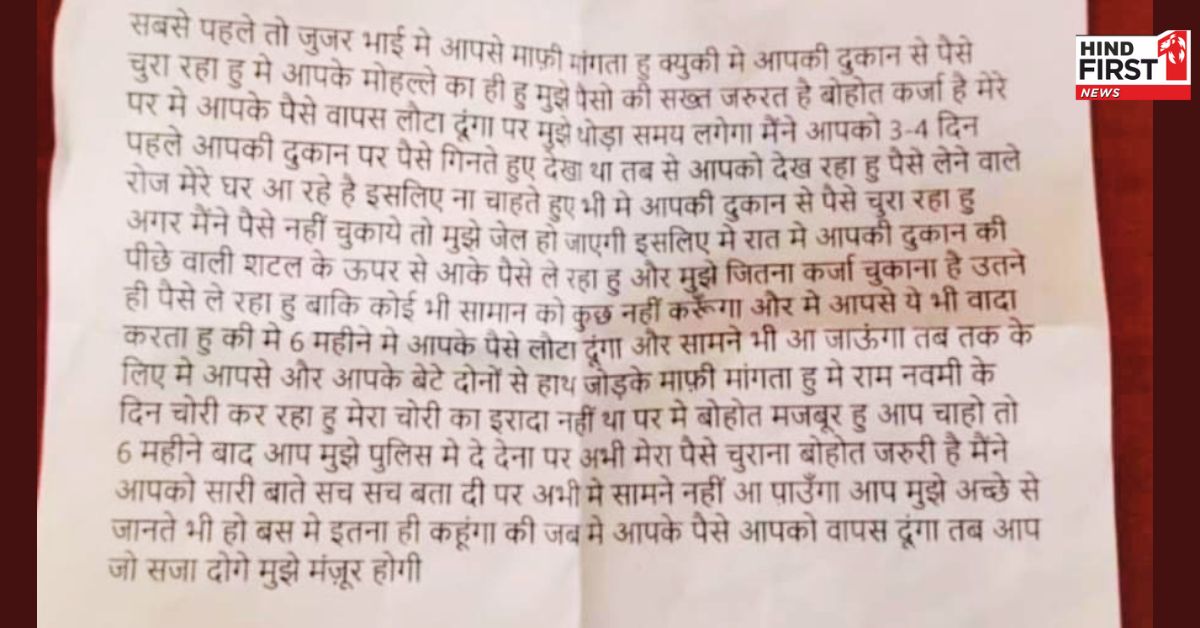 चोरी के बाद चोर दुकानदार के नाम एक चिट्ठी भी छोड़ गया है। चोर ने इस चिट्ठी (Thief Letter To The Shopkeeper) में उसने बताया कि आखिर वह चोरी क्यों कर रहा है। चोर ने अपनी इस चिट्ठी में दुकानदार से माफी मांगते हुए लिखा है कि वह मजबूरी में चोरी कर रहा है, लेकिन वह वादा किया है कि 6 महीने में वह इन पैसों को वापस कर देगा। इस चिट्ठी को पढ़ने के बाद पुलिस और दुकानदार हर कोई हैरान है।दुकानदार के नाम चोर का पत्र
