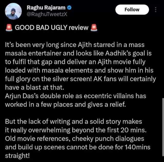 साउथ सुपरस्टार अजित कुमार की लेटेस्ट फिल्म 'गुड बैड अग्ली' 10 अप्रैल 2025 को दुनियाभर में रिलीज कर दी गई है। फिल्म में अजित कुमार और तृषा कृष्णन मुख्य भूमिका में हैं। फिल्म निर्माता आदिक रविचंद्रन के निर्देशन में बनी इस फिल्म को रिलीज होते ही दर्शकों का अच्छा रिस्पॉन्स मिल रहा है। फिल्म का पहला शो देखते ही फैंस ने इसका रिव्यू भी शेयर कर दिया है, जो काफी पॉजिटिव है।