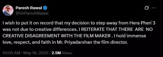 18 मई 2025 को परेश ने अपने 'एक्स' हैंडल पर एक छोटा सा नोट लिखा। उन्होंने ट्वीट करते हुए लिखा, "मैं यह रिकॉर्ड में दर्ज करना चाहता हूं कि 'हेरा फेरी 3' से दूर होने का मेरा फैसला रचनात्मक मतभेदों के कारण नहीं था। मैं फिर से दोहराता हूं कि फिल्म निर्माता के साथ कोई क्रिएटिव असहमति नहीं है। मैं फिल्म निर्देशक श्री प्रियदर्शन के प्रति अपार प्रेम, सम्मान और विश्वास रखता हूं।"