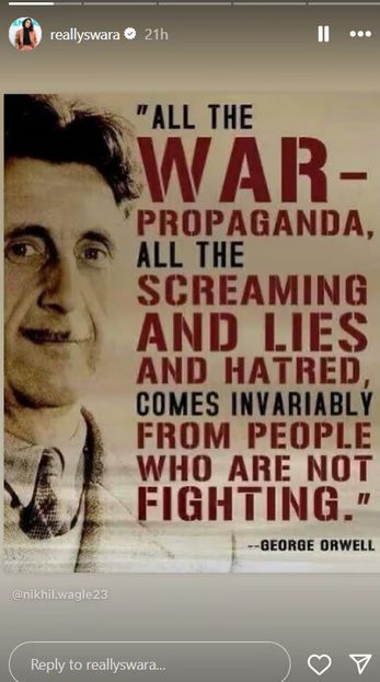 पाकिस्तान और भारत के बॉर्डर पर बढ़ते तनाव के बीच स्वरा भास्कर ने अपने इंस्टाग्राम अकाउंट पर एक पोस्ट शेयर की, जिसमें उन्होंने जियोर्ज ओरवेल का कोट शेयर करते हुए वॉर को प्रोपेगेंडा करार दिया है। कोट में लिखा है, ''हर वॉर प्रोपेगेंडा है, सारी चीख-पुखार, झूठ और नफरत हमेशा उन लोगों से आती है, जो फाइट नहीं कर रहे हैं।''