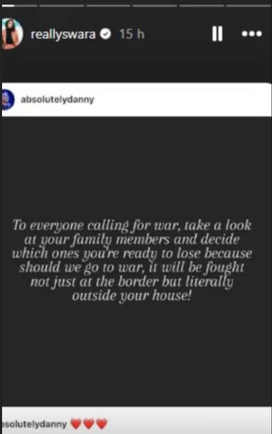 इस पोस्ट के अलावा, स्वरा भास्कर ने दो और इंस्टा स्टोरीज शेयर की हैं। उनमें से एक इंस्टाग्राम यूजर की पोस्ट है जिसमें लिखा है, “जो वॉर चाहते हैं वे एक बार अपने परिवार के सदस्यों को देखें और तय करें कि उनमें से आप किसे खोने के लिए तैयार हैं, क्योंकि अगर हम वॉर में उतरते हैं तो ये सिर्फ बॉर्डर पर नहीं बल्कि सचमुच आपके घर के बाहर ही लड़ी जाएगी।”