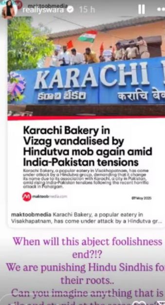 इसके अलावा, स्वरा भास्कर ने एक खबर भी शेयर की, जिसमें हैदराबाद की 'कराची बेकरी' पर तिरंगा लगाने की खबर थी। इस खबर में लिखा था, “इस मूर्खता का अंत कब होगा? हम हिंदू सिंधियों को उनकी जड़ों के लिए दंड दिया जा रहा है, क्या आप ऐसे चीज को इमेजिन कर सकते हैं जो एक ही समय में नीच और मूर्खतापूर्ण हो।''