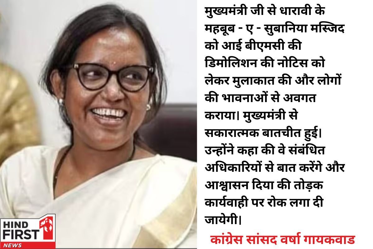 स्थानीय कांग्रेस सांसद वर्षा गायकवाड ने मुख्यमंत्री एकनाथ शिंदे से धारावी की महबूब-ए-सुभानिया मस्जिद को भेजी गई बीएमसी की डिमोलिशन नोटिस के बारे में मुलाकात की। उन्होंने मुख्यमंत्री को लोगों की भावनाओं से अवगत कराया। गायकवाड ने कहा कि उनकी बातचीत सकारात्मक रही, और मुख्यमंत्री ने आश्वासन दिया कि वे संबंधित अधिकारियों से बात करेंगे और तोड़फोड़ की कार्रवाई रोकने का प्रयास करेंगे।