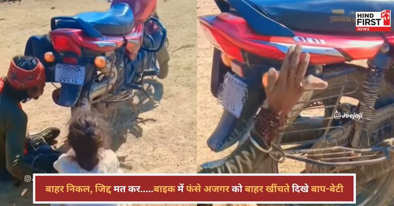 पिता-बेटी की जोड़ी ने दिखाई गजब की हिम्मत, बाइक के टायर में फंसे विशालकाय सांप को खींचा!