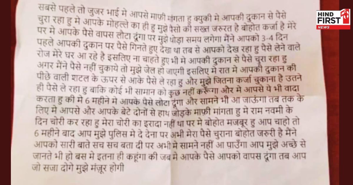 चोरी के बाद चोर दुकानदार के नाम एक चिट्ठी भी छोड़ गया है। चोर ने इस चिट्ठी (Thief Letter To The Shopkeeper) में उसने बताया कि आखिर वह चोरी क्यों कर रहा है। चोर ने अपनी इस चिट्ठी में दुकानदार से माफी मांगते हुए लिखा है कि वह मजबूरी में चोरी कर रहा है, लेकिन वह वादा किया है कि 6 महीने में वह इन पैसों को वापस कर देगा। इस चिट्ठी को पढ़ने के बाद पुलिस और दुकानदार हर कोई हैरान है।