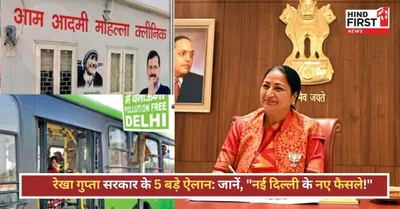 रेखा गुप्ता सरकार के 5 बड़े फैसले: दिल्ली की नई मुख्यमंत्री रेखा गुप्ता ने शपथ के तुरंत बाद एक्शन मोड में आ गई हैं। सरकार ने पिछले 24 घंटे में स्वास्थ्य, परिवहन, पारदर्शिता और महिला सुरक्षा जैसे क्षेत्रों में त्वरित कार्रवाई के संकेत दिए हैं। साथ ही, मोहल्ला क्लीनिक और DTC बसों की जांच के आदेश दिए गए हैं। वहीं, महिलाओं की फ्री बस यात्रा को जारी रखने का ऐलान किया गया है। दूसरी ओर, दिल्ली में आयुष्मान भारत योजना को लागू करने और लंबित CAG रिपोर्ट पेश करने का निर्णय लिया गया है। आइए जानते हैं रेखा गुप्ता सरकार के वो 5 बड़े फैसले जिनको लेकर दिल्ली में सियासी हलचल तेज हो गई है।