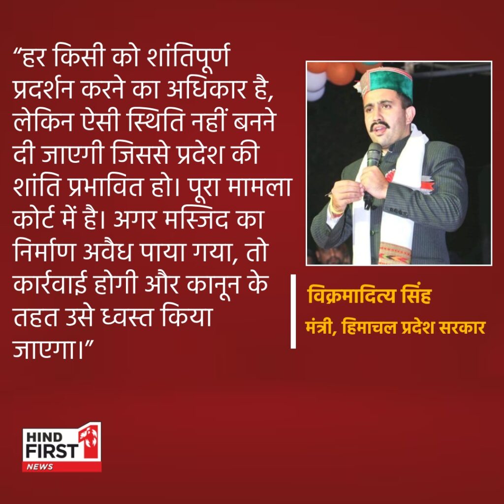 इस विवाद पर हिमाचल प्रदेश सरकार के मंत्री विक्रमादित्य सिंह ने भी बयान दिया। उन्होंने कहा, “हर किसी को शांतिपूर्ण प्रदर्शन करने का अधिकार है, लेकिन ऐसी स्थिति नहीं बनने दी जाएगी जिससे प्रदेश की शांति प्रभावित हो। पूरा मामला कोर्ट में है। अगर मस्जिद का निर्माण अवैध पाया गया, तो कार्रवाई होगी और कानून के तहत उसे ध्वस्त किया जाएगा।”