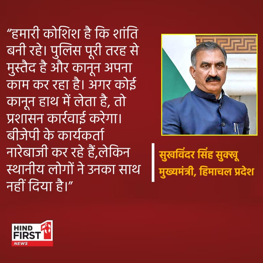 हिमाचल प्रदेश के मुख्यमंत्री सुखविंदर सिंह सुक्खू के मीडिया सलाहकार नरेश चौहान ने इस मामले में प्रतिक्रिया देते हुए कहा, “हमारी कोशिश है कि शांति बनी रहे। पुलिस पूरी तरह से मुस्तैद है और कानून अपना काम कर रहा है। अगर कोई कानून हाथ में लेता है, तो प्रशासन कार्रवाई करेगा। बीजेपी के कार्यकर्ता नारेबाजी कर रहे हैं, लेकिन स्थानीय लोगों ने उनका साथ नहीं दिया है।”