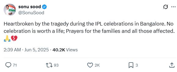 हाल ही में, सोनू सूद ने अपने एक्स हैंडल से एक पोस्ट शेयर की और बेंगलुरु हादसे में 11 लोगों की मौत पर दुख जताया। उन्होंने पोस्ट में लिखा, “बेंगलुरु में आईपीएल समारोह के दौरान हुई त्रासदी से दिल टूट गया। कोई भी जश्न जीवन से बड़ा नहीं होता है। पीड़ित परिवारों और सभी प्रभावित लोगों के लिए प्रार्थना करता हूं।”