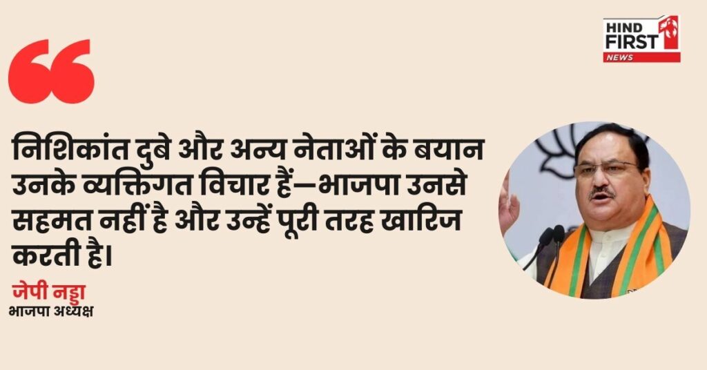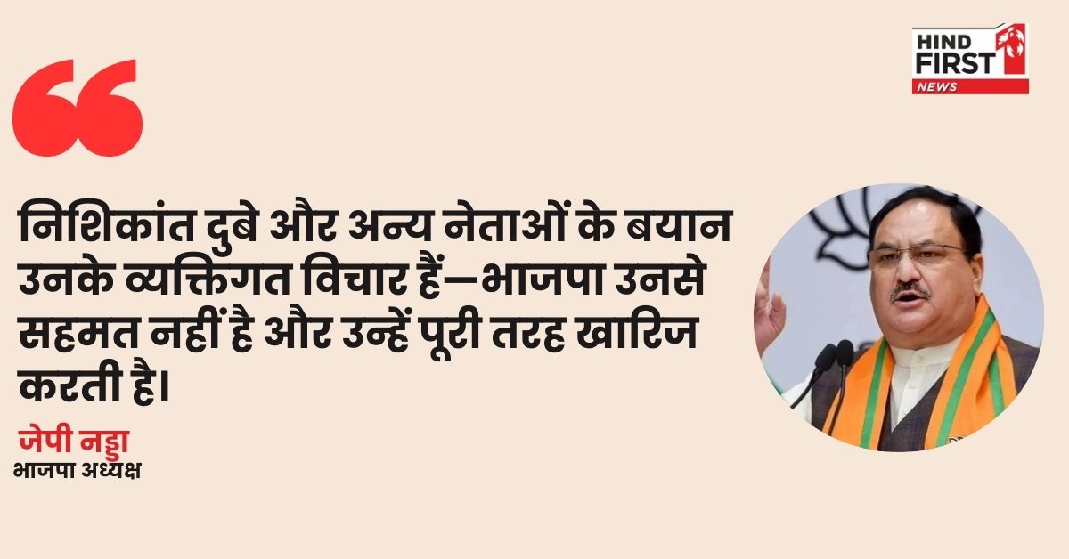 BJP अध्यक्ष जेपी नड्डा ने 19 अप्रैल को X पर स्पष्ट किया कि निशिकांत दुबे और दिनेश शर्मा के बयान व्यक्तिगत हैं, जिनसे पार्टी का कोई लेना-देना नहीं। उन्होंने कहा कि BJP न्यायपालिका का सम्मान करती है और इसके आदेशों को स्वीकार करती है। नड्डा ने नेताओं को ऐसे बयान देने से मना किया।