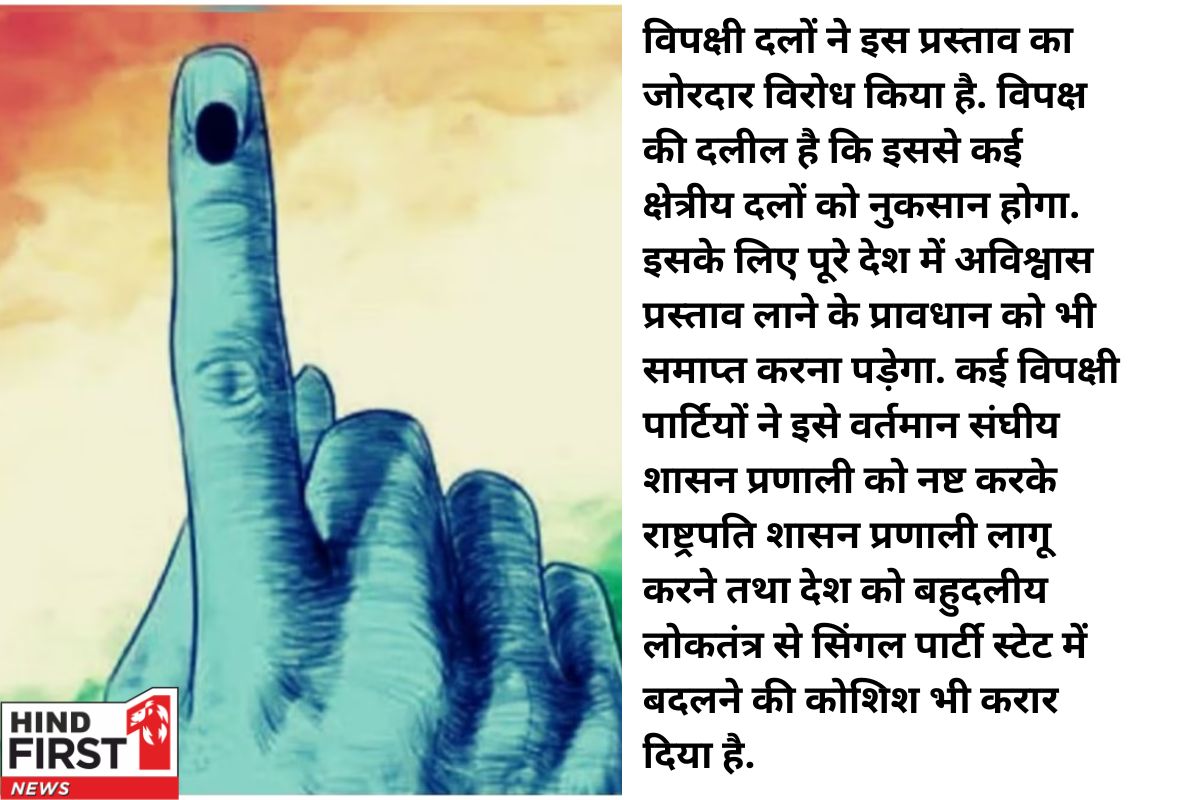 ‘एक देश, एक चुनाव’ के मुद्दे पर कई पार्टियों का समर्थन सामने आया है। एनडीए में बीजेपी के दो प्रमुख सहयोगियों में से जनता दल (यूनाइटेड) इस कदम के समर्थन में है, जबकि तेलुगू देशम पार्टी (TDP) का रुख अभी साफ नहीं है। कोविंद पैनल ने जब TDP से संपर्क किया, तो उनकी ओर से कोई प्रतिक्रिया नहीं मिली। कोविंद की अध्यक्षता वाली समिति ने 62 पार्टियों से संपर्क किया था। इनमें से 47 दलों ने जवाब दिया, जिनमें से 32 ने एक साथ चुनाव कराने के विचार का समर्थन किया, जबकि 15 दलों ने इसका विरोध किया। कुल 15 पार्टियों ने कोई प्रतिक्रिया नहीं दी। इस तरह, पक्ष और विपक्ष में विभिन्न दलों की राय सामने आई है।