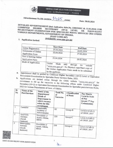 ओडिशा स्टाफ सेलेक्शन कमीशन द्वारा कुल 673 पदों पर भर्ती की जाएगी। जिसमें आयुर्वेदिक असिस्टेंट समेत यूनानी असिस्टेंट, केयरटेकर, होम्योपेथिक असिस्टेंट,जूनियर फिशरीज टेक्निकल असिस्टेंट और अमीन के पदों पर भर्ती की जाएगी। वहीं आयोग द्वारा आवेदन प्रक्रिया के लिए रजिस्ट्रेशन लिंक खोल दिया गया है और इन पदों के लिए आवेदन करने की अंतिम तिथि 24 मई 2024 तय की गई है। साथ ही फार्म में गलतियों को सुधार करने की अंतिम तिथि 29 मई 2024 निर्धारित की गई हैं। आयु सीमा और शैक्षणिक योग्यता