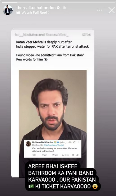 करण को अपनी इस पोस्ट के लिए काफी ट्रोलिंग झेलनी पड़ी। अब, उनकी पोस्ट को शेयर करते हुए कुशाल ने लिखा- ''अरे भाई इसके बाथरूम का पानी बंद करवाओ और पाकिस्तान की टिकट करवाओ।''