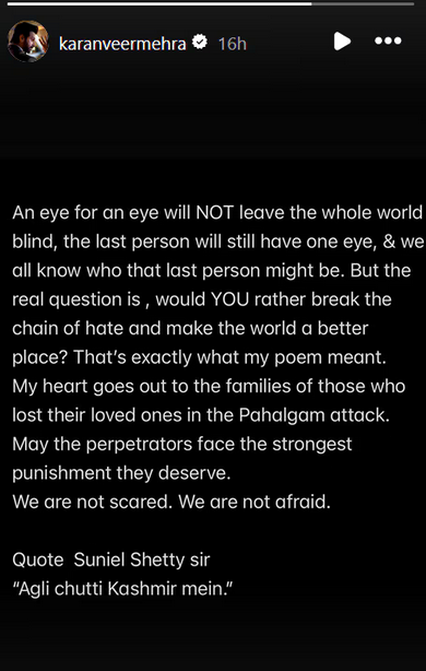 अब, करण वीर मेहरा ने अपनी ट्रोलिंग पर रिएक्ट किया है। उन्होंने अपनी इंस्टा स्टोरी शेयर करते हुए लिखा, ''आंख के बदले आंख से पूरी दुनिया अंधी नहीं हो जाएगी। आखिरी शख्स के पास सिर्फ एक आंख होगी। हम सभी जानते हैं कि वो आखिरी शख्स कौन हो सकता है, लेकिन असली सवाल ये है कि क्या आप नफरत की जंजीर को तोड़ना चाहेंगे और दुनिया को एक बेहतर जगह बनाना चाहेंगे? मेरी कविता का बिल्कुल ये ही मतलब था।'' करण ने अपनी स्टोरी में आगे लिखा, ''पहलगाम अटैक में जिन फैमिली ने अपने लोगों को खोया है, उनके लिए मेरा मन भर गया। जिन्होंने ऐसा किया है उन्हें सजा मिलनी चाहिए, जो वो डिजर्व करते हैं। हम डरे हुए नहीं हैं।'' इसके बाद, लास्ट में करण ने बॉलीवुड एक्टर सुनील शेट्टी की लाइन का रेफरेंस देते हुए लिखा, ''अगली छुट्टी कश्मीर में।'' ये भी पढ़ें: Next Story