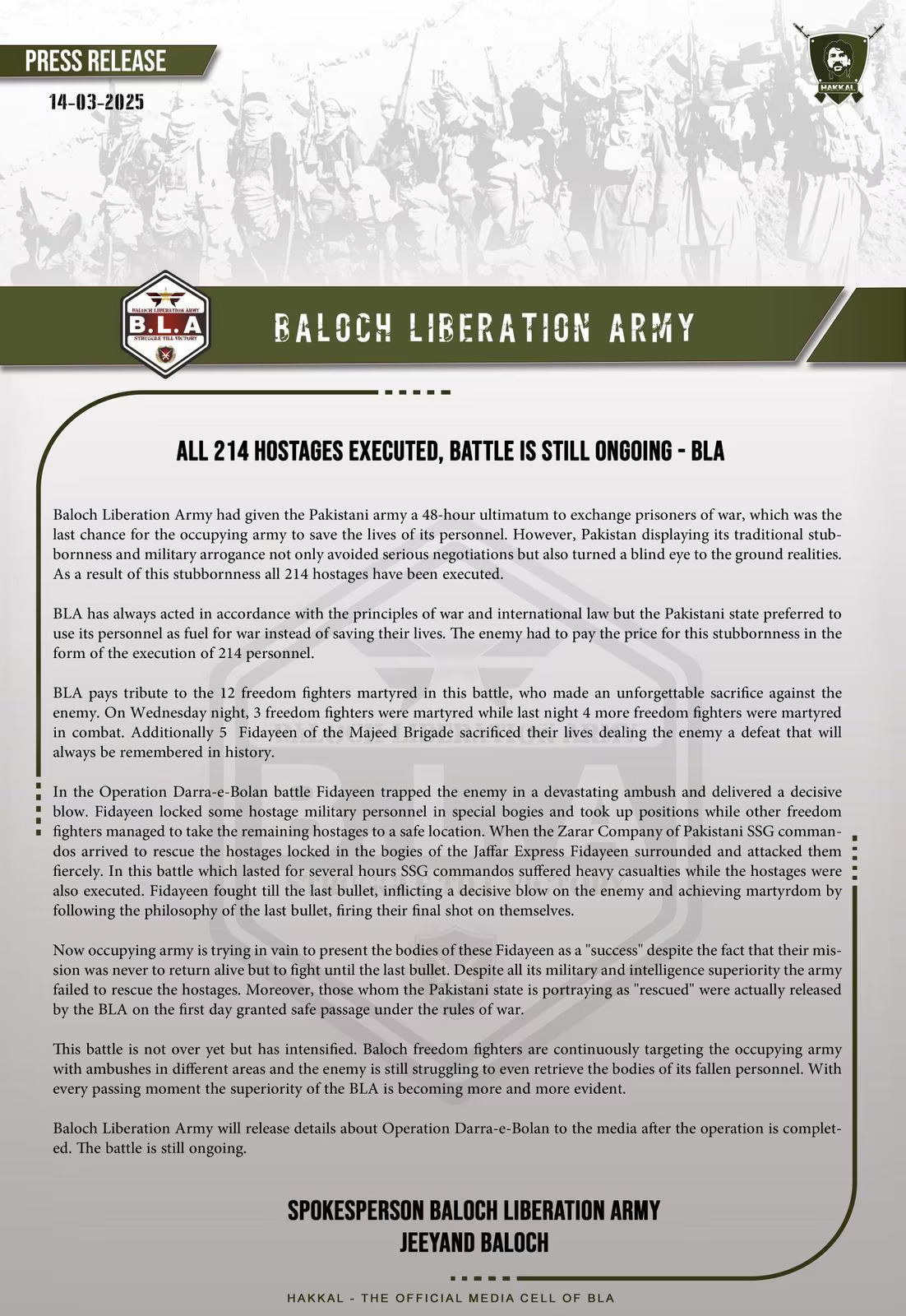 बलूच लिबरेशन आर्मी ने दावा किया कि उन्होंने पाकिस्तानी सेना के 214 जवानों को मार डाला। पाकिस्तान ने ऑपरेशन खत्म होने का दावा किया, लेकिन BLA ने इसे झूठ बताया।