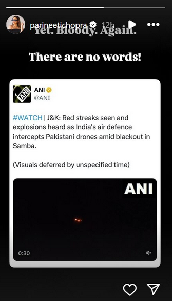 भारत और पाक के बढ़ते तनाव के बीच परिणीति चोपड़ा ने पाकिस्तानियों के खिलाफ अपना गुस्सा जाहिर किया। उन्होंने अपनी इंस्टाग्राम स्टोरी पर एक खबर का स्क्रीनशॉट शेयर किया, जिसमें जानकारी दी गई है कि इंडियन एयरफोर्स ने पाकिस्तान के ड्रोन को मार गिराया है। ये ड्रोन सांबा में दिखाई दिया था, जिसके बाद शहर में ब्लैकआउट कर दिया गया। इस पोस्ट को शेयर करते हुए उन्होंने लिखा, ''दोबारा बाज नहीं आ रहे हैं, शब्द नहीं हैं मेरे पास।''