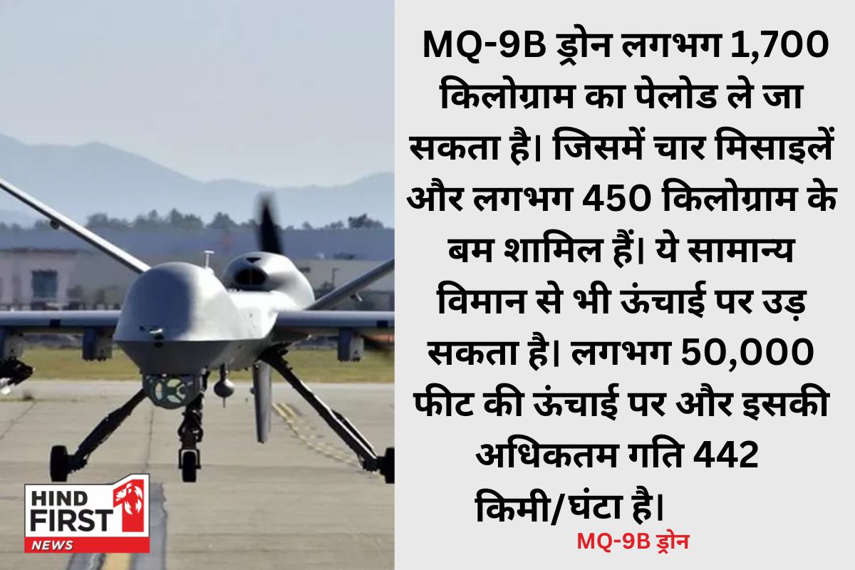 MQ-9B ड्रोन लगभग 1,700 किलोग्राम का पेलोड ले जा सकता है। जिसमें चार मिसाइलें और लगभग 450 किलोग्राम के बम शामिल हैं। यह बिना ईंधन भरे 2,000 मील की यात्रा कर सकता है। यह ड्रोन एक सामान्य विमान से भी ऊंचाई पर उड़ सकता है। लगभग 50,000 फीट की ऊंचाई पर और इसकी अधिकतम गति 442 किमी/घंटा है। ड्रोन की एक और महत्वपूर्ण विशेषता है कि ये लंबे मिशन पर किसी भी मौसम में तैनात होने की क्षमता रखता है। एयर-टू-एयर मिसाइलों के अलावा इसे एयर-टू-ग्राउंड मिसाइलों से भी लैस किया जा सकता है। कोलकाता में सेमीकंडक्टर प्लांट की स्थापना