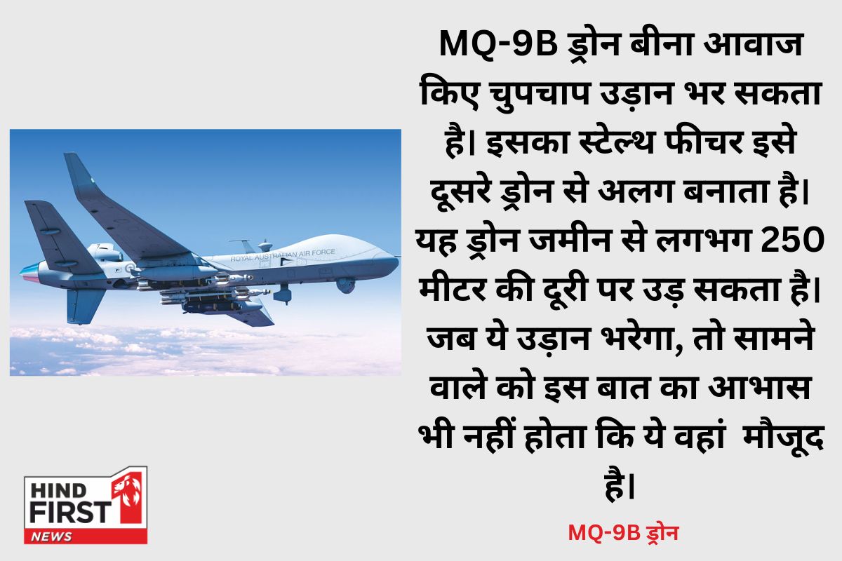 MQ-9B प्रीडेटर ड्रोन की खास बात ये है कि ये बीना आवाज किए चुपचाप उड़ान भरने की क्षमता रखता है। इसका स्टेल्थ फीचर इसे दूसरे ड्रोन से अलग बनाता है। यह ड्रोन जमीन से लगभग 250 मीटर की दूरी पर उड़ान भर सकता है। इसकी खासियत है कि जब ये उड़ान भरेगा, तो सामने वाले को इस बात का आभास भी नहीं होता कि ये वहां ( जब तक कि इसे देखा न जाए) मौजूद है।