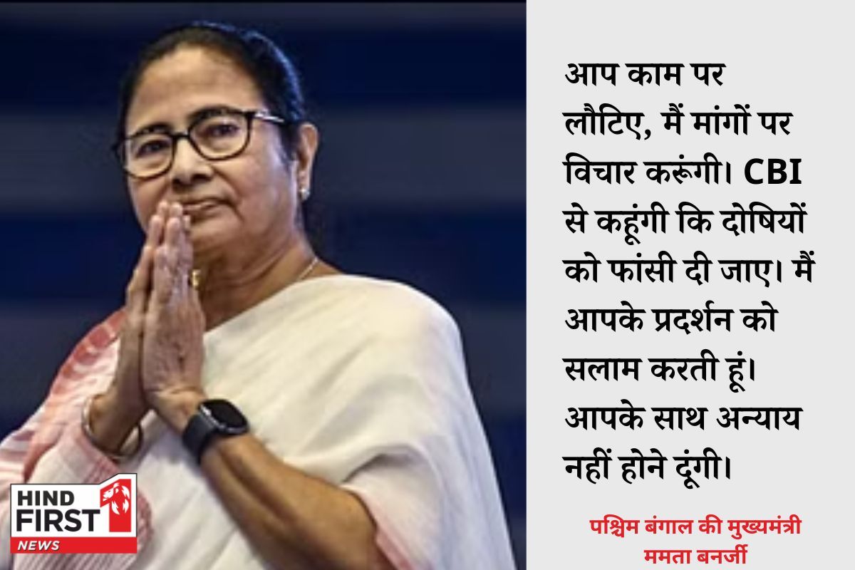 मुख्यमंत्री ममता ने डॉक्टरों से कहा कि वे काम पर लौटें और उनकी मांगों पर गंभीरता से विचार किया जाएगा। उन्होंने कहा कि वे सीबीआई से आग्रह करेंगी कि दोषियों को कड़ी सजा दी जाए। ममता ने यह भी घोषणा की कि वह राज्य के सभी सरकारी अस्पतालों की रोगी कल्याण समितियों को भंग कर देंगी। ममता ने कहा कि यह उनकी अंतिम कोशिश है बातचीत करने की और लोकतांत्रिक आंदोलन को दबाने में विश्वास नहीं करती हैं।