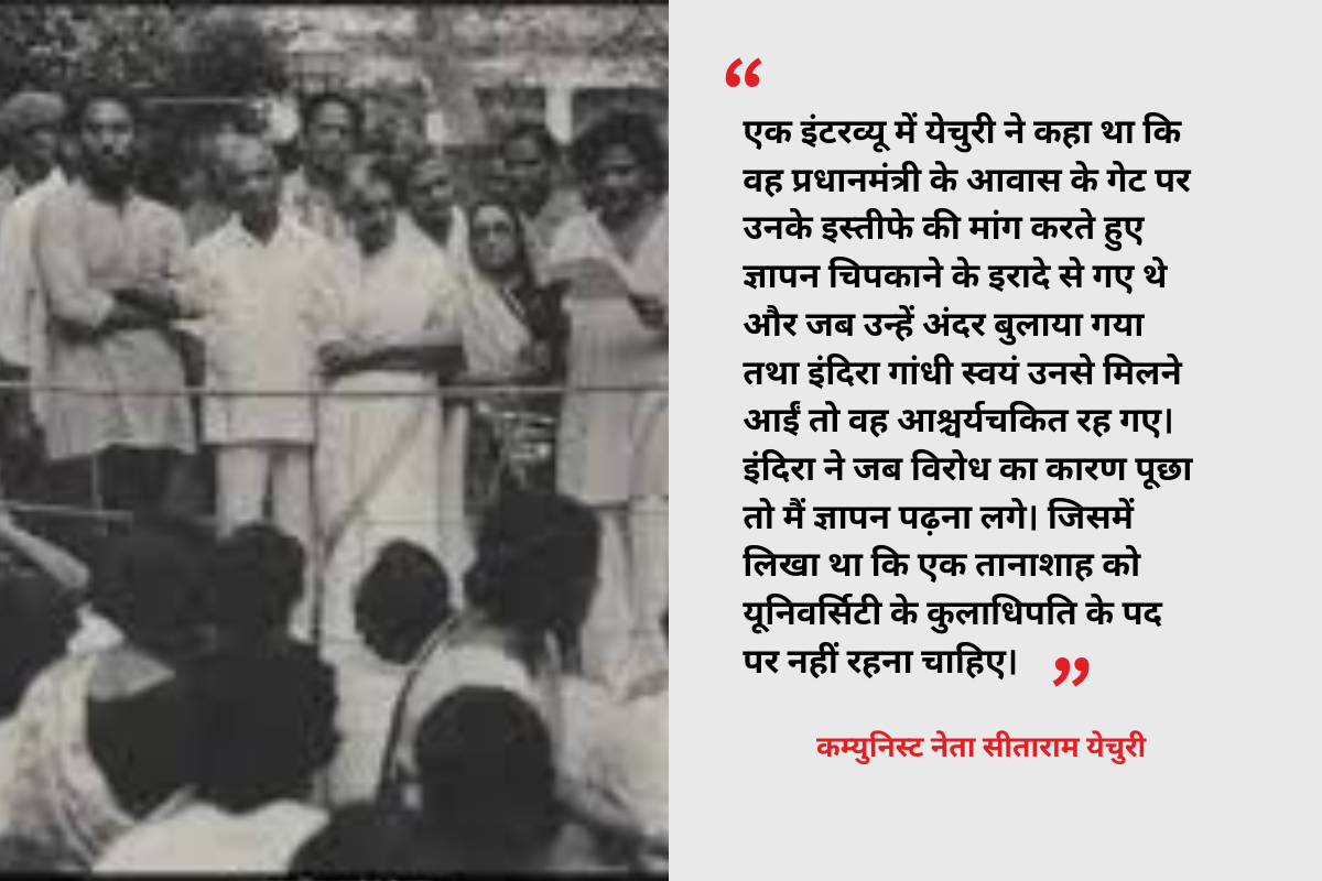इंदिरा ने जब विरोध का कारण पूछा तो येचुरी ज्ञापन पढ़ने लगे। उन्होंने अपने ज्ञापन में लिखा था कि एक तानाशाह को यूनिवर्सिटी के कुलाधिपति के पद पर नहीं रहना चाहिए। आपातकाल के दौरान इंदिरा जेएनयू में एक कार्यक्रम करना चाहती थी, लेकिन मामला इतना बढ़ गया कि इंदिरा को अपने कदम पीछे खिचने पड़े।