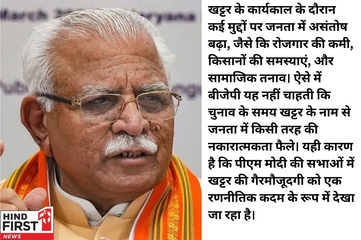 खट्टर के कार्यकाल के दौरान कई मुद्दों पर जनता में असंतोष बढ़ा, जैसे कि रोजगार की कमी, किसानों की समस्याएं, और सामाजिक तनाव। ऐसे में बीजेपी यह नहीं चाहती कि चुनाव के समय खट्टर के नाम से जनता में किसी तरह की नकारात्मकता फैले। यही कारण है कि पीएम मोदी की सभाओं में खट्टर की गैरमौजूदगी को एक रणनीतिक कदम के रूप में देखा जा रहा है।