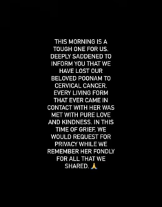 पूनम पांडे की इस पोस्ट पर लिखा है कि “यह सुबह हमारे लिए कठिन है. आपको यह बताते हुए बहुत दुख हो रहा है कि हमने सर्वाइकल कैंसर के कारण अपनी प्यारी पूनम को खो दिया है. उनके कॉन्टेक्ट में आने वाला हर इंसान उनसे प्यार से मिला. दुःख की इस घड़ी में, हम प्राइवेसी की रिक्वेस्ट करेंगे। ये एक्ट्रेस के इंस्टाग्राम पर पोस्ट किया गया है जिसके बाद सभी के होश उड़ गए है।