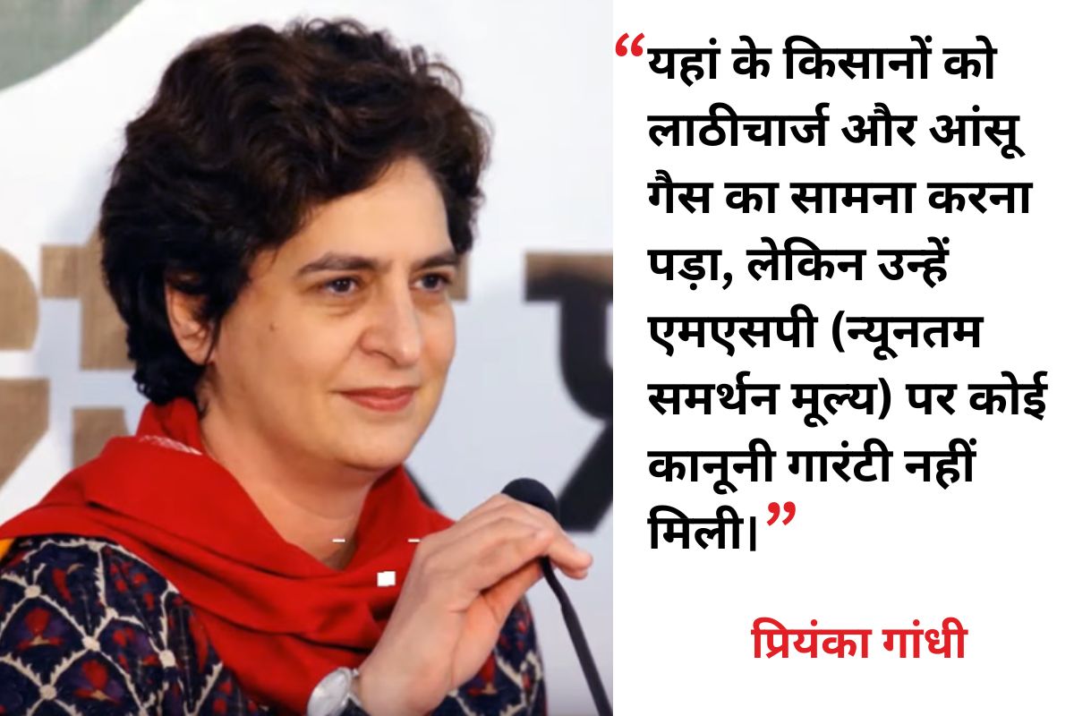 प्रियंका गांधी ने सभा में कहा, "यहां के किसानों को लाठीचार्ज और आंसू गैस का सामना करना पड़ा, लेकिन उन्हें एमएसपी (न्यूनतम समर्थन मूल्य) पर कोई कानूनी गारंटी नहीं मिली।"