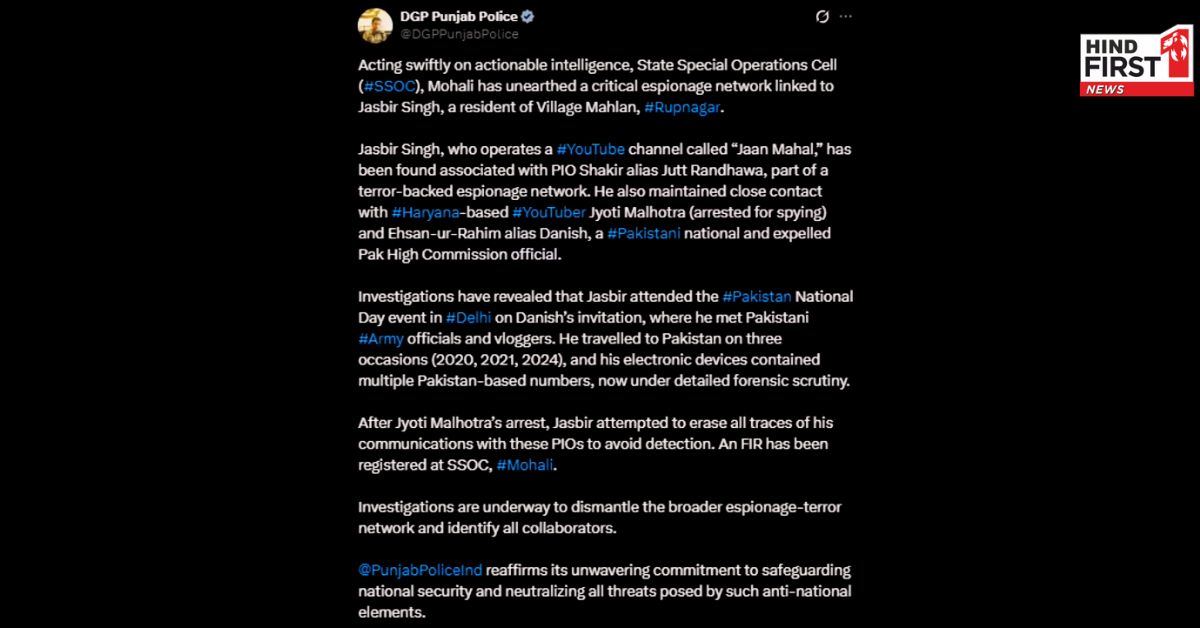 Punjab Police Arrested Pakistani Spy[/caption] पाकिस्तान के जासूसी के आरोप में जसबीर सिंह गिरफ्तार पंजाब पुलिस के डीजीपी गौरव यादव के अनुसार, जसबीर सिंह ने पाकिस्तानी संचालकों के लिए काम करने के संदेह (Pakistani spies in Punjab) में भारतीय मूल के कई व्यक्तियों (पीआईओ) के साथ निकट संपर्क बनाए रखा। इनमें हरियाणा की यूट्यूबर ज्योति मल्होत्रा, जिन्हें पहले जासूसी के आरोप में गिरफ्तार किया गया था, और एहसान-उर-रहीम उर्फ दानिश, एक पाकिस्तानी नागरिक और पाक उच्चायोग से निष्कासित अधिकारी शामिल हैं। PAK नेशनल डे कार्यक्रम में जसबीर सिंह ने की शिरकत पंजाब पुलिस के डीजीपी के अनुसार, जसबीर सिंह को दानिश ने दिल्ली में आयोजित पाकिस्तान राष्ट्रीय दिवस कार्यक्रम में आमंत्रित किया था, जहां उन्होंने कथित तौर पर पाकिस्तानी सेना के अधिकारियों और ब्लॉगर के साथ बातचीत की थी। ऐसा भी कहा जाता है कि उन्होंने 2020, 2021 और 2024 में तीन अलग-अलग मौकों पर पाकिस्तान की यात्रा की है। डीजीपी ने कहा कि उनके जब्त किए गए इलेक्ट्रॉनिक उपकरणों में कई पाकिस्तान स्थित संपर्क नंबर थे, जो अब फोरेंसिक विश्लेषण के अधीन हैं। [caption id="attachment_91708" align="alignnone" width="1200"]
