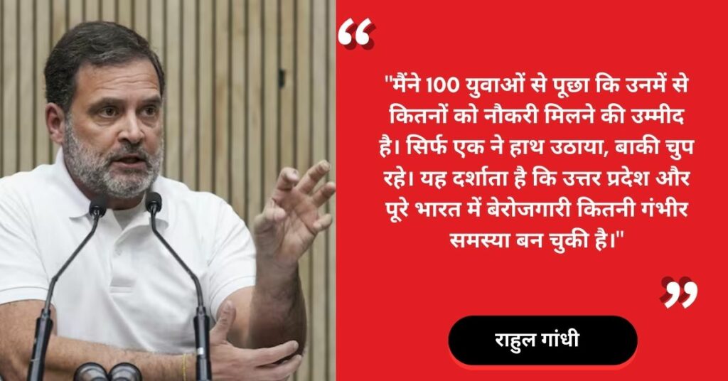 राहुल गांधी ने उत्तर प्रदेश में बढ़ती बेरोजगारी पर भी सरकार को घेरा। उन्होंने कहा कि आज राज्य में 99% युवा मानते हैं कि उन्हें नौकरी नहीं मिलेगी।उन्होंने दावा किया कि मोदी सरकार ने निजीकरण और पूंजीपतियों के पक्ष में नीतियां बनाकर गरीब और दलित युवाओं के लिए नौकरियों के अवसर खत्म कर दिए हैं।