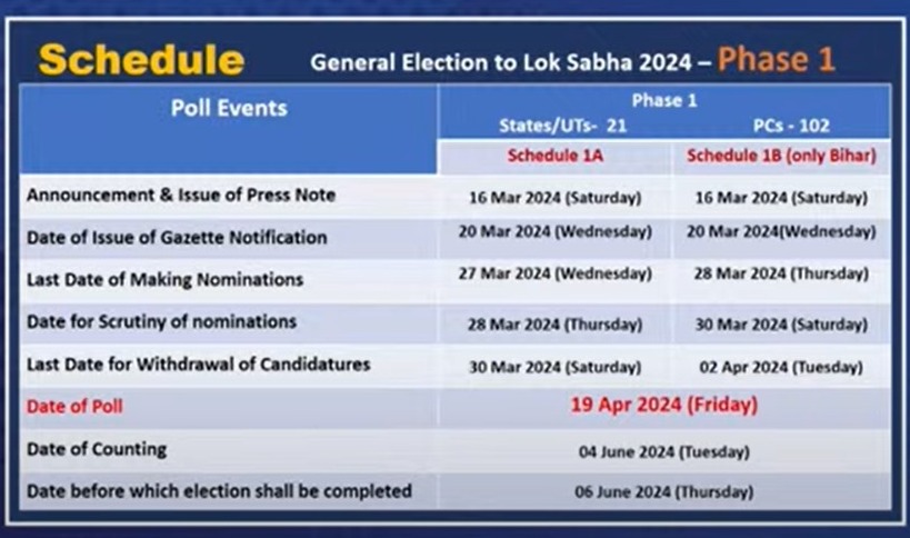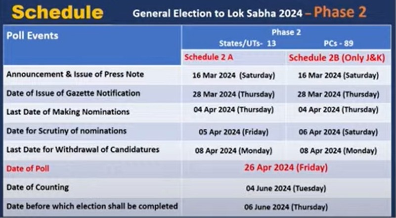 अधिसूचना- 28 मार्च नामांकन की अंतिम तारीख- 4 अप्रैल नामांकन की जांच- 5 अप्रैल नामवापसी- 8 अप्रैल तक मतदान- 26 अप्रैल मतगणना- 4 जून