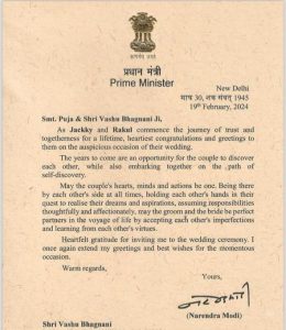 कपल के शादी के मोके पर पीएम नरेंद्र मोदी को भी निमंत्रण पत्र भेजा गया था, ऐसे में वह किसी वजह से शादी में शामिल नहीं हो सकें। इसके बदले प्रधानमंत्री Narendra Modi ने रकुल प्रीत सिंह और जैकी भगनानी को एक पत्र के जरिए बधाई दी है। जिसे जैकी भगनानी ने सोशल मीडिया पर अपने फैंस को शेयर किया है।