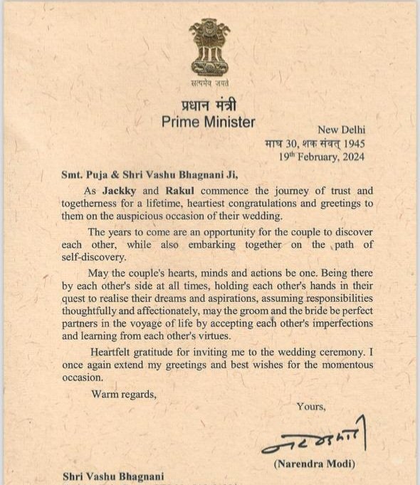 Rakul And Jackky Wedding: सुपरस्टार के अलावा प्रधानमंत्री Narendra Modi ने भी दी रकुल प्रीत-जैकी भगनानी को बधाई, शेयर किया लेटर