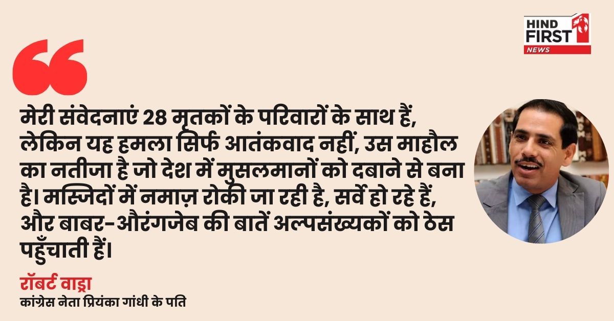 23 अप्रैल को ANI से बातचीत में वाड्रा ने पहलगाम हमले की निंदा जरूर की, लेकिन उनके बयान ने बवाल खड़ा कर दिया। उन्होंने कहा कि: “मेरी संवेदनाएं 28 मृतकों के परिवारों के साथ हैं। यह कायरतापूर्ण कृत्य है, मगर देश का माहौल इसके लिए जिम्मेदार है।” “मुसलमानों को मस्जिद में नमाज से रोका जाता है, मस्जिदों के सर्वे हो रहे हैं, जैसे संभल में। बाबर, औरंगजेब की बातें अल्पसंख्यकों को ठेस पहुंचाती हैं।”