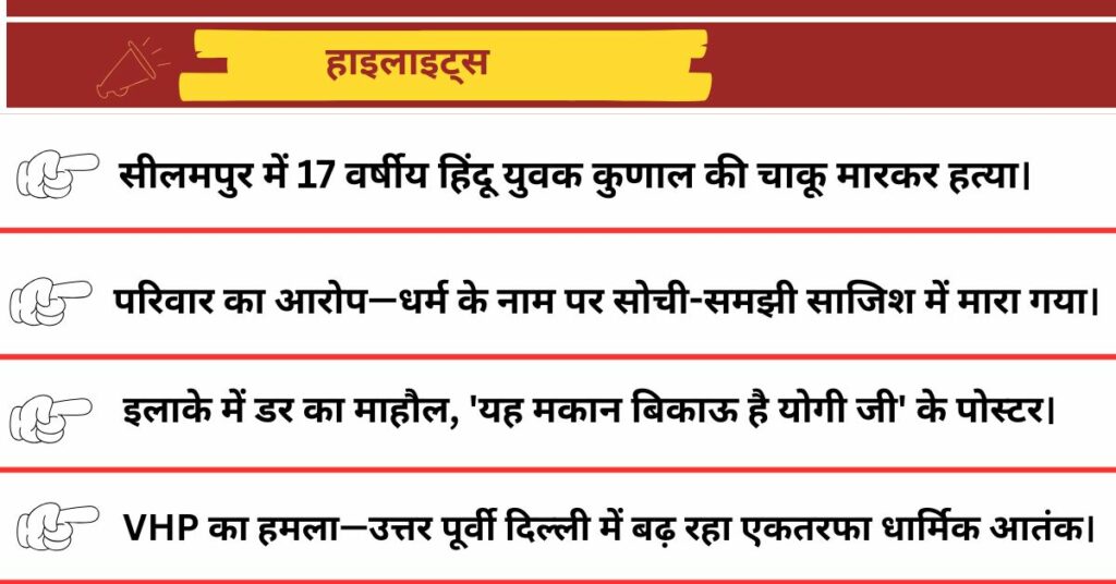 सीलमपुर में हिंदू किशोर की हत्या के बाद तनाव, परिवारों ने लगाए 'मकान बिकाऊ है योगी जी' पोस्टर, VHP-BJP ने पुलिस पर उठाए सवाल।