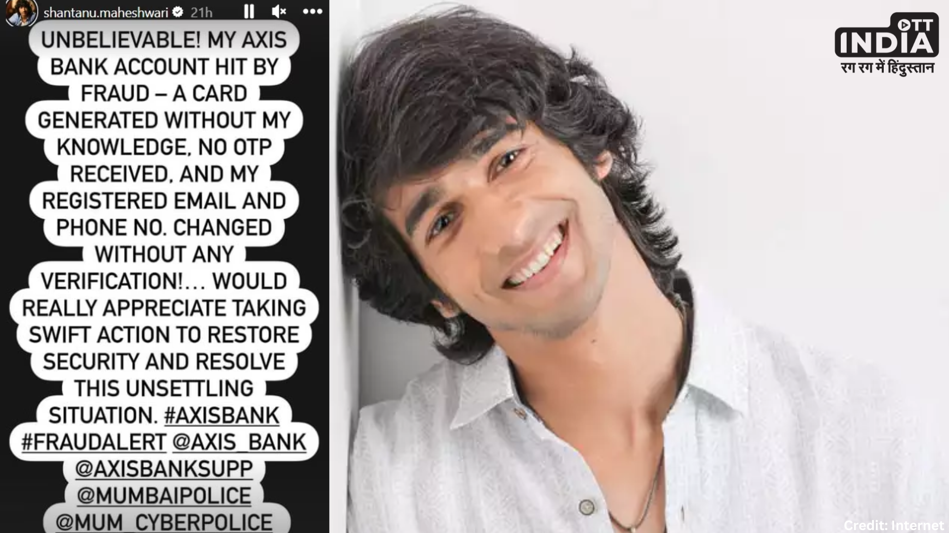 शांतनु ने अपने सोशल मीडिया अकाउंट इंस्टाग्राम पर एक पोस्ट शेयर करते हुए बताया कि मुझे विश्वास नहीं हो रहा है कि मेरा एक्सिस बैंक अकाउंट धोखाधड़ी की चपेट में आ गया है। मेरी जानकारी के बिना मेरे अकाउंट से एक कार्ड को जेनरेट किया गया और मुझे उससे संबंधित कोई ओटीपी नहीं मिला। उन्होंने आगे बताया कि मेरा रजिस्टर्ड ईमेल और फोन नंबर बिना किसी जानकारी के बदल दिया गया है। इस पोस्ट के जरिए एक्टर ने इस मामले पर मुंबई पुलिस से तुंरत कारवाई के लिए गुहार लगाई है। उन्होंने अपने पोस्ट में मुंबई पुलिस, एक्सिस बैंक और साइबर पुलिस को टैग भी किया है। पोस्ट वायरल होने के बाद लोगों ने जताई चिंता